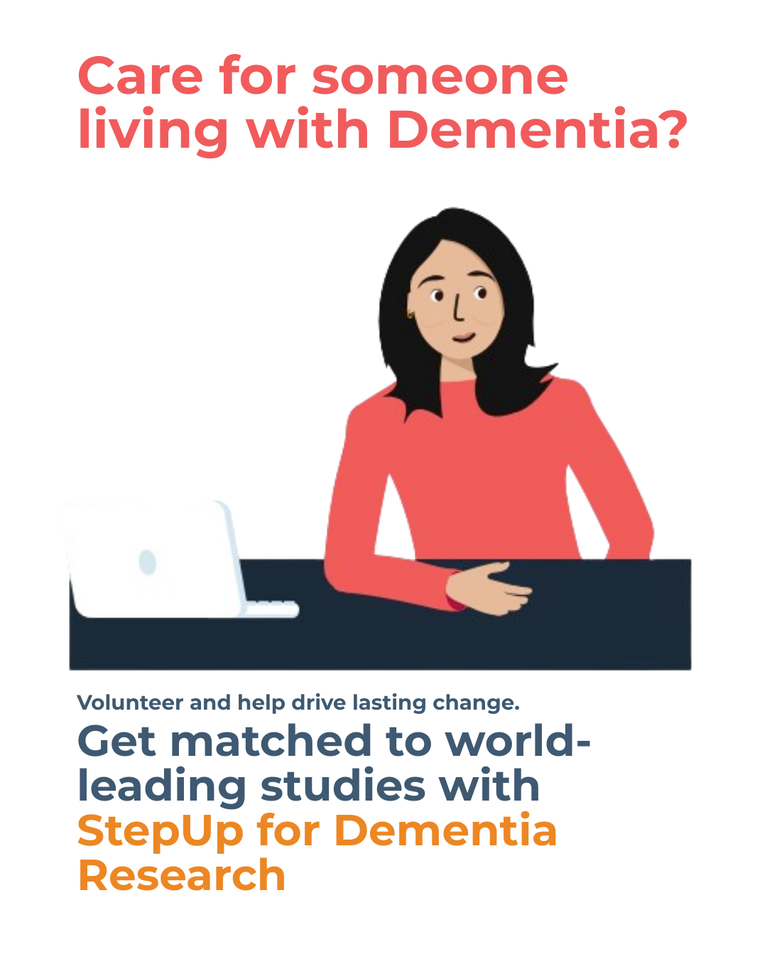 StepUp for Dementia Research connects people living with dementia, their families, carers and healthy volunteers with researchers, supporting vital research to improve diagnosis, treatment and care.