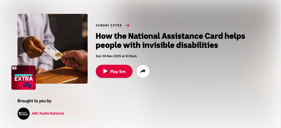 The National Assistance Card supports people with autism and people with brain injury to communicate their needs, helping businesses, emergency services and service providers respond appropriately and with confidence.